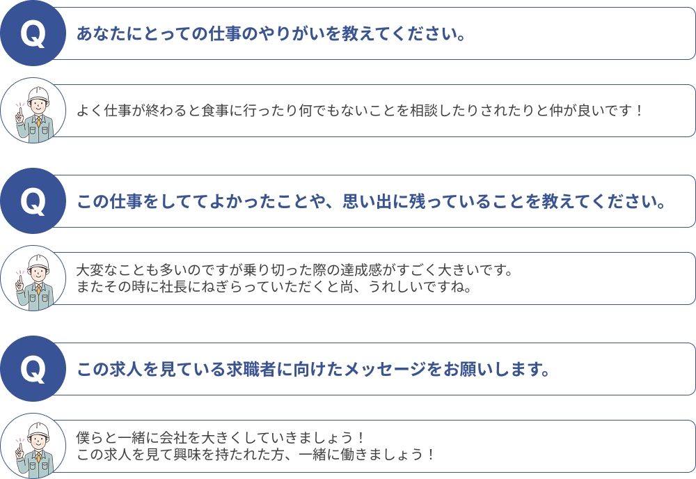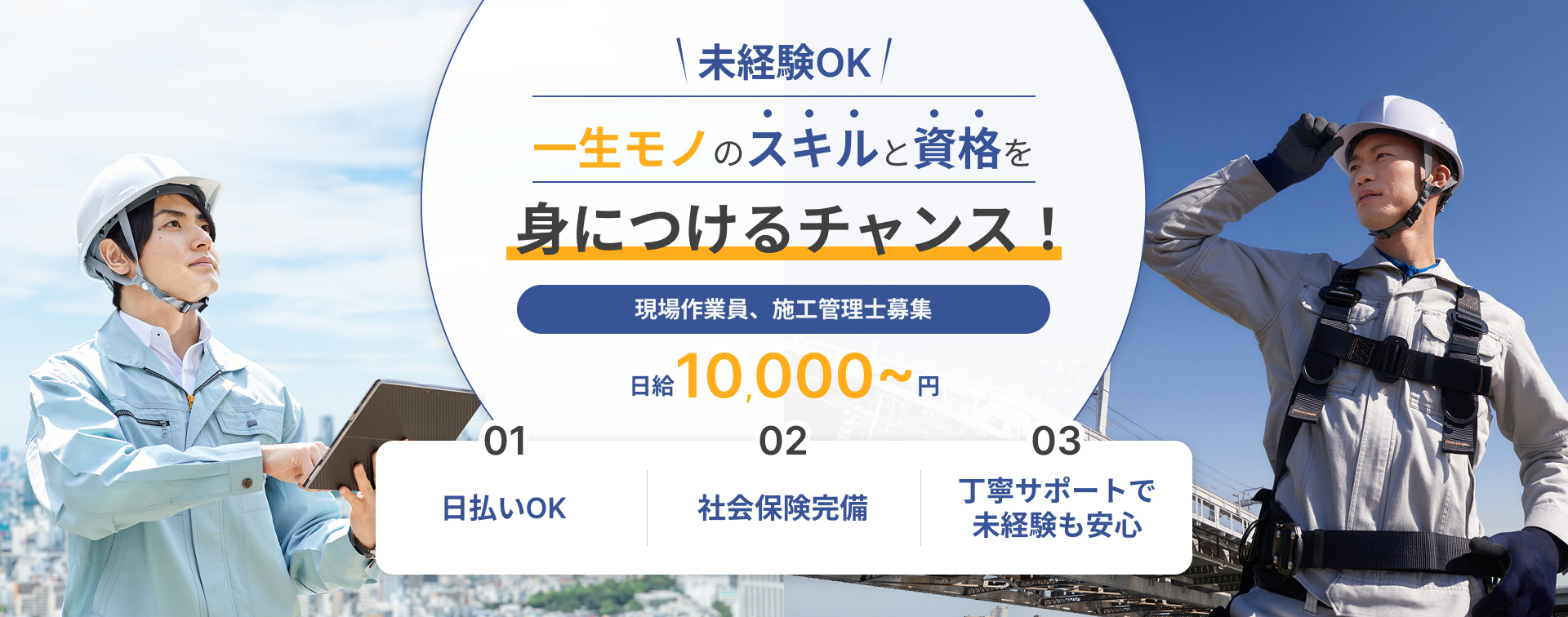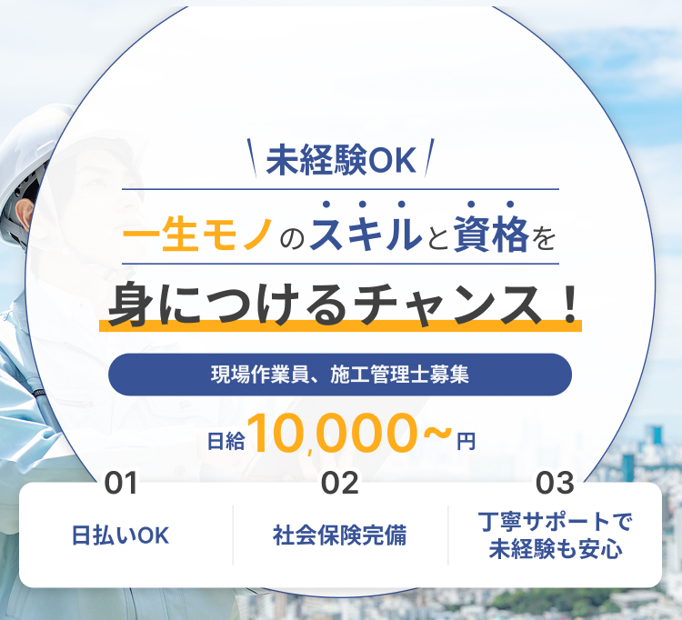 | 給与 | 現場作業員:日給 10,000円~(経験に応じて) 施工管理員:月給 210,000円~(経験に応じて) |